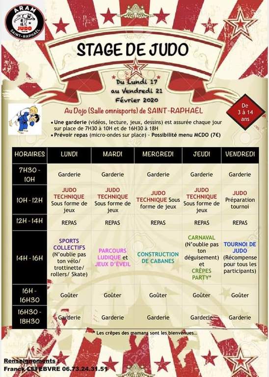 Nos Ecoles de Judo Lefebvre/Darbelet (St Raphaël, Montauroux, Gassin, La Londe, Le Lavandou-Bormes, Draguignan, Trans, La Motte), vous proposent un stage durant les vacances scolaires pour les enfants du 3 à 14 ans, du 17 février au 21 février avec L'ARAM Judo de Saint Raphael .