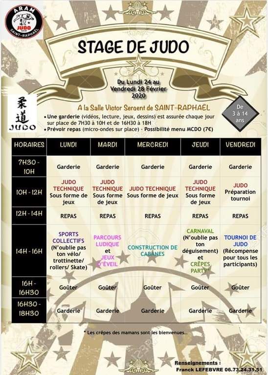 Nos Ecoles de Judo Lefebvre/Darbelet (St Raphaël, Montauroux, Gassin, La Londe, Le Lavandou-Bormes, Draguignan, Trans, La Motte), vous proposent un stage durant les vacances scolaires pour les enfants du 3 à 14 ans, du 24 février au 28 février avec l'école de St Raphaël .